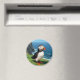 A sweet puffin magnet that has a cute illustration of a puffin sitting by the sea on an seaside dune or ledge.