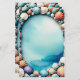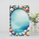 Elegant Coastal Design: Features an array of colorful seashells framing a calming blue watercolor background, evoking the peacefulness of the seaside.