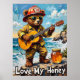 This heartwarming artwork captures a bear dressed in firefighter gear, including a helmet and sunglasses, playing an acoustic guitar while standing on a textured rock by the sea. A jar of honey with a dipper rests close by. The background features a dynamic ocean and a partly cloudy sky. The painting's thick, textured strokes add to the endearing quality of the image, with the words "Love My Honey" featured below.