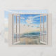 A beautiful calm seaside scene with seagulls flying and the sun coming up, as seen through an open window.