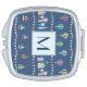 Whimsical illustrated pattern of a cheerful village decorated with bunting for a summer gala with colorful sailboats and hot air balloons on cute compact mirror to personalize with an initial.