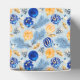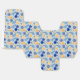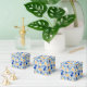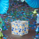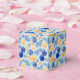 A Festive Party Favor Box In Blues and Yellows For The Holiday Season Patterned In Tree Ornaments