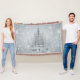 Winter Trees Throw - In muted silver blue colors, a stand of line art pine trees- standing in a snow scene done in bokeh style - Season of Joy written in modern calligraphy