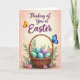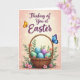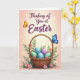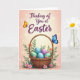 Designed with a soft peach-to-cream gradient background, this card centers on a woven wicker basket that feels cozy and close, like something shared between friends. Inside the basket sit pastel eggs in aqua, mint, and lavender, some dotted with tiny polka dots that add a gentle, affectionate touch 🐰. Green leaves and small pink blossoms spill around the base, as if the arrangement was set down with care for someone special 🌷. Near the top, a flowing line of seasonal text is placed prominently in deep purple, hovering above the basket like a quiet note. Scattered golden light points and small starburst shapes twinkle across the upper area, giving the scene a soft glow without overpowering it. A golden-orange butterfly floats to the left of the text, while a sapphire-blue butterfly rests on the basket handle on the right, their positions creating a tender sense of balance. The basket’s braided handle curves upward, with the blue butterfly perched near its top edge against the warm background.