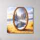 A mirror resting on sand reflects a snowy landscape beneath a summer sky.