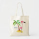 Tote bag with the text: Seasons Greetings. A whimsical drawing of a pink flamingo wearing a red santa hat. Standing on a mound of yellow beach sand with a green and brown coconut palm tree in the back. Cute and fun festive tropical design.