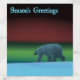 A polar bear roams the ice during the long polar night; the Northern Lights in red and green glow in the distance. Text reading "Season's Greetings" also appears in glowing blue and white. (Greeting card with matching design also available)