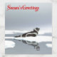 A digital painting of a brown and white Ribbon Seal resting on an ice floe on a very gray and dreary day. Text reading, "Season's Greetings" appears in red. (Greeting cards with matching design also available)