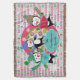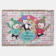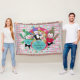 Beautiful Christmas holiday throw blanket features three adorable penguins in ice skates, sweaters, striped scarves, and winter hats on a background of white with colorful text that reads Happy Holidays and Seasons Greetings, a solid pink area with white snowflakes, and a white center with snowflakes on orbs. You can easily personalize with your family name!