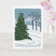 Winter landscape with snow, trees, and distant hills. The tree in the front has festive lights all over. Digital composition of hand-painted acrylic on paper. This modern style illustration includes the colors blue, green, white, cream. Inside: Season's Greetings