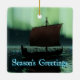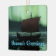 A slightly stylized image of a Viking longship sailing at night under the Northern Lights there a couple of icebergs; most of the crew is asleep. "Season's Greetings" appears in glowing blue and white. This is a faded, or vintage version of the brighter original image which is also available.