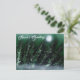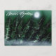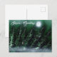 A Season's Greetings Wintergreen its starting to snow scene with trees, berries and shrubs against a green background with white light by artist Jason Girard.