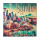 This artistic image of Seattle showcases the iconic Space Needle standing tall against the city’s modern skyline. The scene captures Elliott Bay with boats in the foreground and the majestic Mount Rainier in the background. The vibrant colors and sunny day evoke the dynamic energy and natural beauty of this Pacific Northwest city. The style blends realism with warm, inviting tones to create a picturesque view.