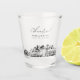 Modern Seattle skyline shot glass favor gift with "cheers" script. The design showcases a stunning sketch with the ability to customize your names and exact location. Enter the Zazzle design tool for additional customizations.