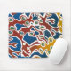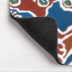 Mousepad decorated with a screenprinted design of seaweed in gold, maroon and green on a blue and white background