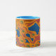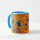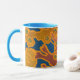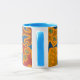 White mug with blue handle and rim, decorated with a screenprinted seaweed design.