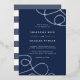 Elegant coastal wedding invitation design features your wedding day details in white lettering on a navy blue background, accented at the corners with loops of braided nautical rope in silver foil. Invitations reverse to wide nautical stripes.
