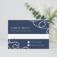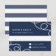 Elegant coastal wedding RSVP card features your desired response date and custom accept/decline wording in white on a navy blue background, accented at the corners with loops of braided nautical rope. Cards reverse to wide nautical stripes.