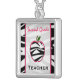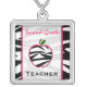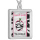A necklace for 2nd grade teachers featuring a background of zebra print. Matching apple inside sheer center with pink trim. Text reads "Second Grade Teacher."