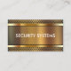 Security business card with modern design that includes simulated gold metal background elements printed on the front and text you can personalize on two sides in this smart design template you can customize. Designed for surveillance systems, alarm system monitoring, or security video cameras and equipment.