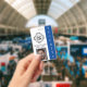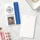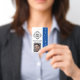 This identification badge for a security guard or employee features a white background with a sample logo in the center. You can personalize the ID badge to display your own company, business or organization logo, or your own custom image. There is an area beneath the logo to print an employee name or other text. The word "SECURITY" is printed along the right side over a blue banner. A sample photo is printed in the bottom portion which you can replace to make your own photo ID. The back of the badge has a blue background with white text where you can include your company phone number or other information.