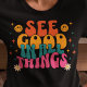 Embrace positivity and a splash of color with our 'See Good In All Things' graphic tee. The bold, fun lettering paired with charming smiley faces and twinkling stars captures the essence of optimism. This design is perfect for those who love to spread joy and maintain a sunny disposition. Whether you're out with friends or just enjoying a relaxing day, this shirt is sure to lift spirits and inspire smiles. It's more than just fashion; it's a way to carry and share a powerful message of positivity with the world.