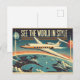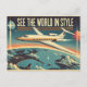✅ Here’s the vintage travel postcard featuring a stylized jet soaring through the sky with elegant, streamlined wings and a golden stripe. ✈️🌏✨ The background showcases a view of Earth with blue oceans, scattered clouds, and glowing city lights. The bold, elegant 1950s-style typography reads "See the World in Style", giving it a nostalgic, aviation-inspired vibe