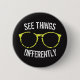 This button has a black background and a grunge style graphic in lime green of a pair of vintage style glasses frames. The message in grunge style letters reads, "See Things Differently" but you can use the fill-in-the-blank spaces to add your own message or personalize this pin with a name. This eyeglasses design coordinates with other items in the Spectacular Spectacles collection from Awkward Design Co.