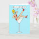A cartoon of a lady wearing a red bikini and a face mask as she reclines in an oversized cocktail glass. The lady is saying 'See you at spring break!' The image has a pale blue colored background.