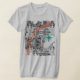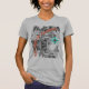 A futuristic shirt with an intricate computational / fractal / geometric / algorithmic / kaleidoscopic pattern, crescent moons and a symbol for Science. The text could be customised. Grey, orange, turquoise blue