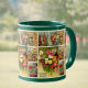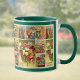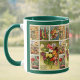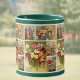 This garden and farming mug features a collage of public domain seed packet and seed catalog art available on the Public Domain. The artwork features hollyhocks, sweet peas, and other flowers, as well as vegetables like lettuce, watermelon, and pumpkins. The image are bordered in green and hunter green. The mug shown here has green trim on the inside and on the handle as well.