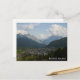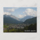 Postcard with photo of Seefeld in Austria nestled amongst mountains with blue sky and clouds.