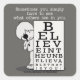 Little Boy stands behind a giant eye chart covering his eye with an occluder/paddle. The quote, "Sometimes you simply have to see what others see in you." The eye chart spells out the Little Boy, Big Dreams quote of "Believe in the Unbelievable that is You!" Quotes ©Little Boy, Big Dreams, LLC and David A. Carrizales and artwork © Christie Black of Creations from the Heart.