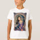 A teenage girl who is one of my original characters, she has long lark hair and wears a fancy, lacy purple tank top with a blue shawl. Lilies are around her, and a purple arch frames the picture. She smiles earnestly. Behind a dark ocean wave curls.
