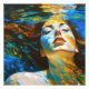 “Selene” - Women In Water. In this serene, colourful fine art women water scene, a beautiful woman with long red hair floats in a blue swirling sea. Sunlight dapples her peaceful face beneath the water's surface. With eyes closed and face lifted, she absorbs the light, embodying a strong, resilient, and inspiring figure in this multi-coloured picture.