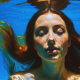 “Selene” - Women In Water. In this serene, colourful fine art women water scene, a beautiful woman with long red hair floats in a blue swirling sea. Sunlight dapples her peaceful face beneath the water's surface. With eyes closed and face lifted, she absorbs the light, embodying a strong, resilient, and inspiring figure in this multi-coloured picture.