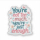 A gentle reminder in every letter — this “You’re Not Too Much. You’re Just Enough.” sticker is a soft-spoken anthem of self-love and emotional validation. Designed with a bouncy handwritten font, decorated with blooming flowers and fluttering butterflies, this sticker radiates warmth, grace, and growth. Perfect for anyone on a healing journey or looking to have something that speaks kindly to their heart. Because being fully yourself is more than okay — it’s beautiful.
