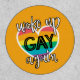 Fun self-ironic LGBTQ Pride rainbow flag patch featuring the caption Woke up gay again in white and black modern lettering decorated with a colorful rainbow heart.