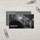 A business card template with a black semi-circular panel decorated with a white dotted line in the bottom left for your Company name and business type. The semi-circular panel is placed over a photo or artwork background (which can also be changed). Name and other contact details on the reverse.