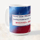 Patriotic 15oz. classic ceramic coffee mug featuring a colorful abstract stars and stripes pattern with gradient colors and tiny starlights. Navy blue 'Happy 250th Anniversary America, Semiquincentennial • July 4th 2026' and red modern name are framed with blue and red borders. See 'About' for more information and care.