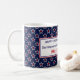 Ideal for end of school gift for coach, teacher, school nurse. Stylish red stars inside white outlined stars on navy blue background decorate this 11oz. classic ceramic mug. Navy blue 'Happy 250th Birthday America, Semiquincentennial • July 4th 2026' and red name are framed with red and blue borders. Available in several styles, and for those who love a bigger cup, a 15oz option is included.