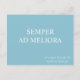 A motivational postcard featuring the Latin phrase ‘semper ad meliora’. A popular phrase in Ancient Rome, the translation is ‘always toward better things’. It reminds us to focus on moving forward toward greater things without looking back. The typographic postcard features crisp white text on a turquoise blue background.The lettering has a classical feel evoking Roman public inscriptions and the English translation is in a contrasting font.