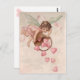 In this vintage image a cute little dark-haired angel with beautiful large, translucent wings is flying with a basket and spilling pink hearts from the sky. She is sending love your way!