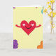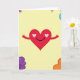 This card shows a big red heart character in the middle, with arms stretched wide like it’s offering a hug 💘. The heart has a wide smile drawn with a thin black line, and its eyes are two small white hearts that make it look sweet and welcoming. Behind it is a warm yellow background that feels sunny and calm. The red heart has gentle shading so it doesn’t look flat, and it stands out clearly against the yellow. Around the edges, you can spot rounded shapes in purple, blue, and orange, like friendly little figures or balloons watching from the sides. There isn’t any text on the card, so the happy face and open arms do all the talking ❤️. It’s an easy, cheerful design that fits romance, affection, or friendship, and it’s ready for you to share Valentine’s Day sentiments with someone you care about 😘.