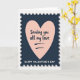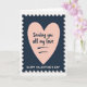 This Valentine's Day card shows a stamp-like design centered on a deep navy blue rectangle with a white perforated edge, like a piece of mail. In the middle, there’s a blush pink heart that stands out softly against the dark background. Inside the heart, the words “Sending you all my love” appear in a flowing, hand-drawn cursive style in dark ink. Just below that message are two thin horizontal lines, suggesting a spot where someone could add a name or short note. Along the bottom of the blue area, “HAPPY VALENTINE’S DAY” is written in simple white capital letters. A small shadow around the stamp shape makes it look slightly raised, like it could be placed on an envelope. It feels meaningful because it connects love with the idea of sending a note, which can be a sweet way to show you’re thinking of someone 🥰❤️. Hope it helps you share your Valentine’s Day sentiments.