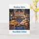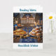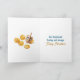 Happy Hanukkah card with sweet holiday blessings of Sending warm Hanukkah wishes with illustrations of the menorah, potato pancakes and jelly doughnuts. Inside is a dreidel and gold coins.