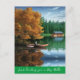 Saying Hi with this postcard showing a person in a canoe on the lake and a log cabin, and beautiful Autumn trees in the background.