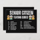 Looking for a unique and humorous gift for the senior in your life? Look no further than our senior's texting code postcard! It's the perfect way to poke fun at the struggles of texting while also celebrating the joys of staying connected. With clever and witty codes like 'ATD - At The Doctor' and 'BTW - Bring The Wheelchair', this postcard is sure to put a smile on anyone's face. And with its durable materials and eye-catching design, it's the perfect keepsake for a 90th, 80th, 70th, or 60th birthday. Give the gift of laughter and communication with our senior's texting code postcard!