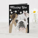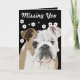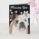 This British Bulldog portrait is so sad, with big doleful brown eyes and sad expression set against a black and white flower patterned background. The editable text reads “Missing You” Perfect to send to someone you are missing during Lockdown.