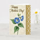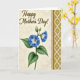 This design shows a tall green stem rising through the center, carrying two large trumpet-shaped blue flowers with white rays that draw your eye toward their yellow-green centers. Along the stem, a few closed buds and serrated green leaves trail downward, giving the arrangement a gentle, caring look ❤️. In the upper left, the words “Happy Mother’s Day!” sit in a warm sepia tone with smooth, flowing lettering that feels like a soft spoken note. The background is creamy beige with faint, shadowy floral shapes that sit quietly behind the main bloom. On the right edge, a vertical golden-ochre strip adds structure, like a decorative ribbon placed beside the bouquet 🌼. Inside that strip, a repeating pattern of small diamond shapes frames lighter centers, adding a cozy, traditional touch. The blue petals show fine white striping that fans outward, while the right-side border keeps its neat diamond motif from top to bottom.